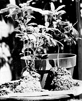 With the return of spring, the containers were placed under high deciduous shade on a black plastic ground cover, along with several dozen sibling plants from the same seedling batches, which had spent the winter in specially prepared beds under lath and plastic protection. The container mix used for these latter plants consisted of equal parts of Canadian peat, well-rotted leaf mold and fine sand, to which gypsum, super phosphate and cotton seed meal had been added. These plants also were given a 23-19-17 foliar spray three times during the growing season. The test plants received no fertilizer, although it is possible that on one occasion, they were slightly exposed to drift from foliage nutrients being sprayed on the other containers.