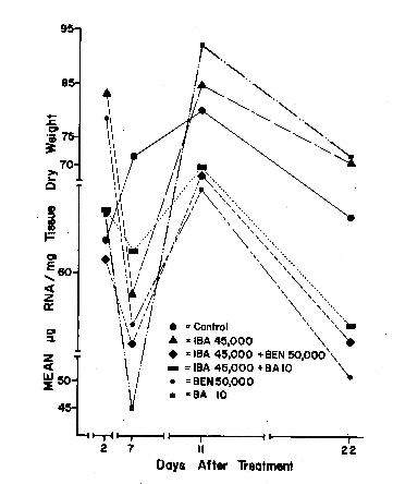 There were no significant differences among the sampling dates of the protein contents. Very little change was observed in protein contents due to treatments. Protein changes may be expected to lag behind RNA changes since RNA synthesis is a prerequisite for protein synthesis. Perhaps if the experiment had been continued for a longer period of time, a change would have eventually been observed reflecting the RNA pattern.